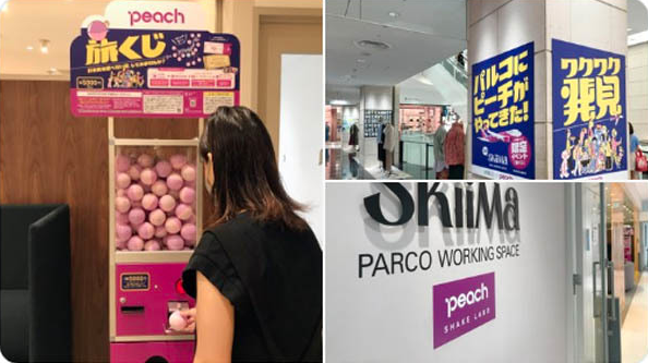 피치가 상업 시설 「신사이바시 PARCO(오사카·츄오구)」에 설치한 「여행지」는 캡슐 안에 「행선지」와「행선지까지의 항공권을 구입할 수 있는 피치 포인트」나"여행의 미션"등이 쓰인 종이가 들어가 있어 열 때까지 행선지 등은 모릅니다.