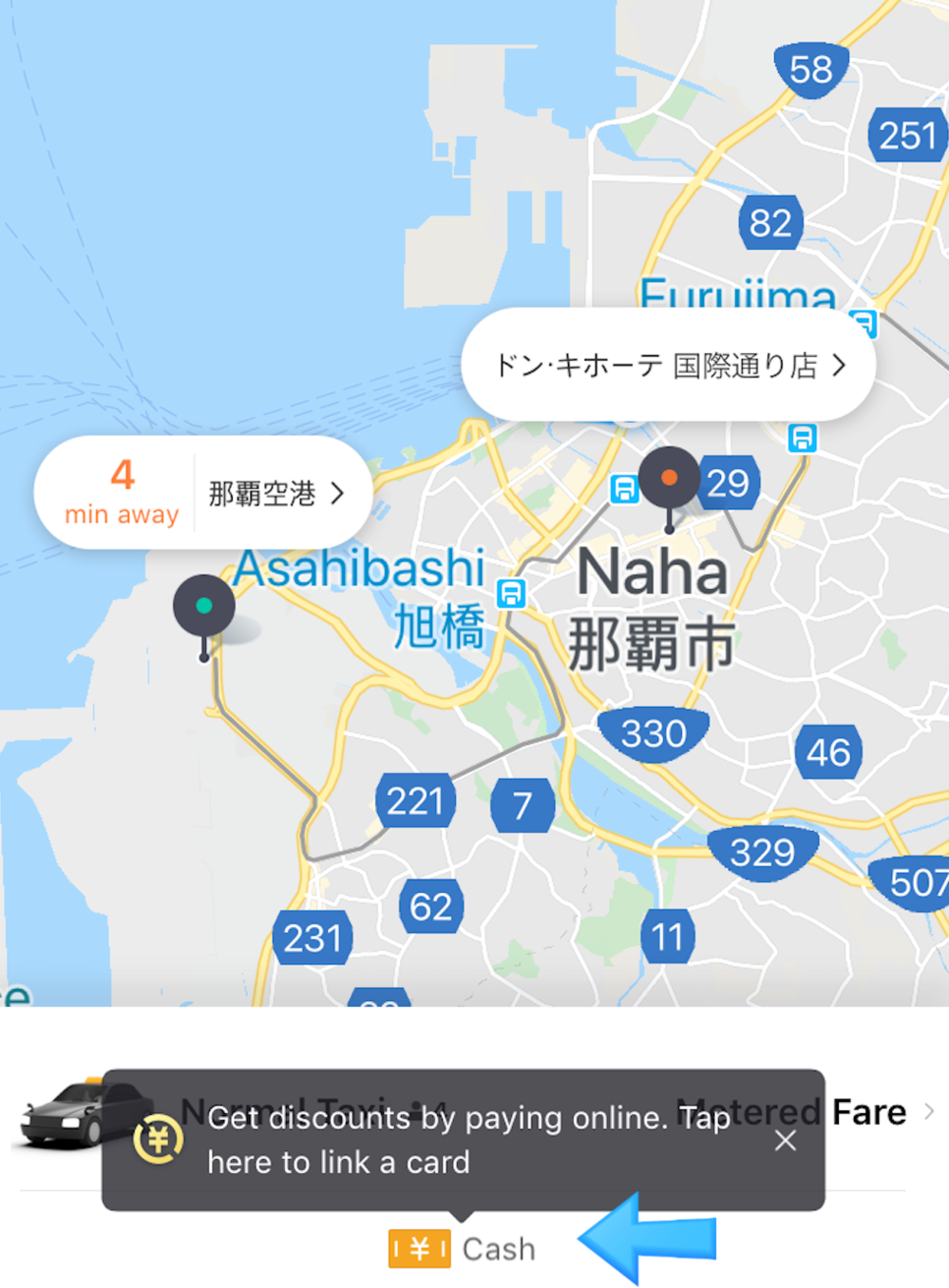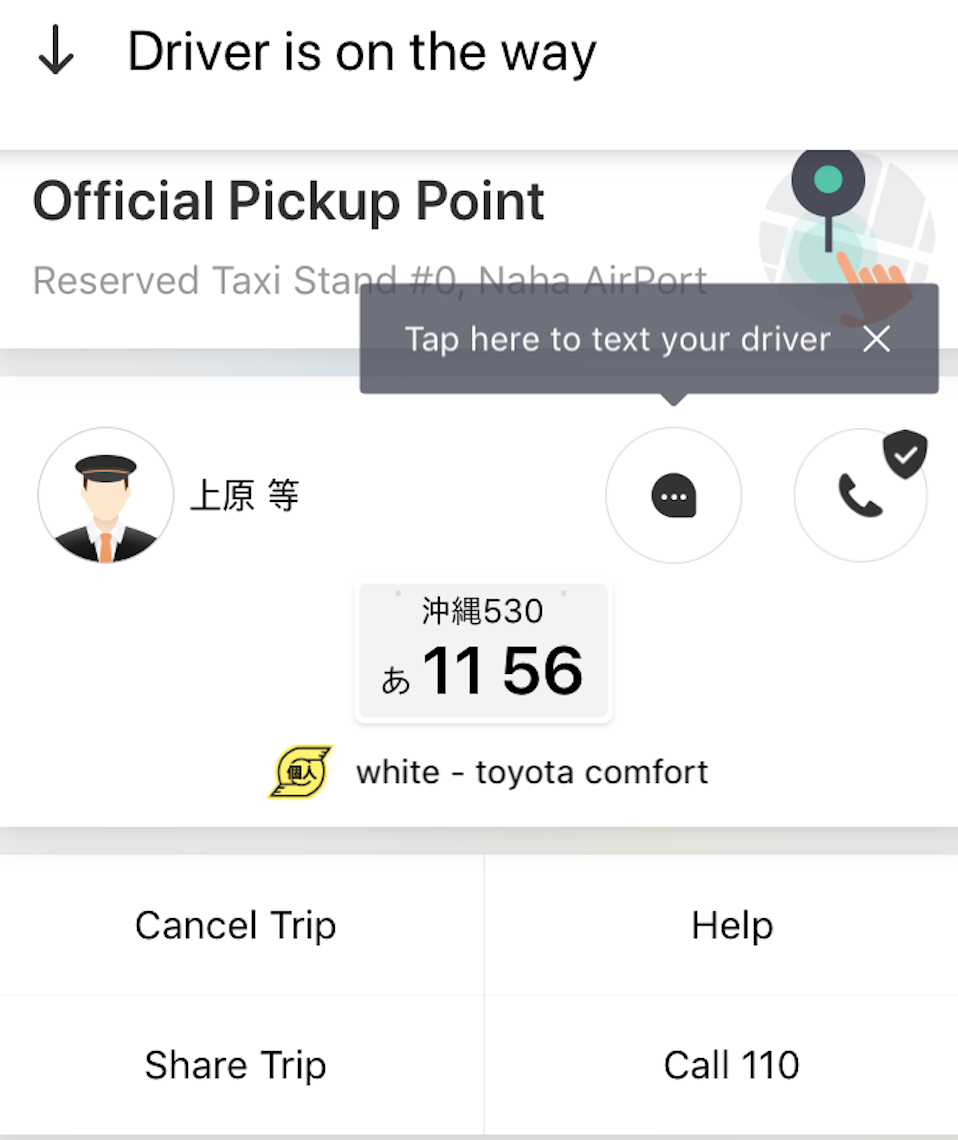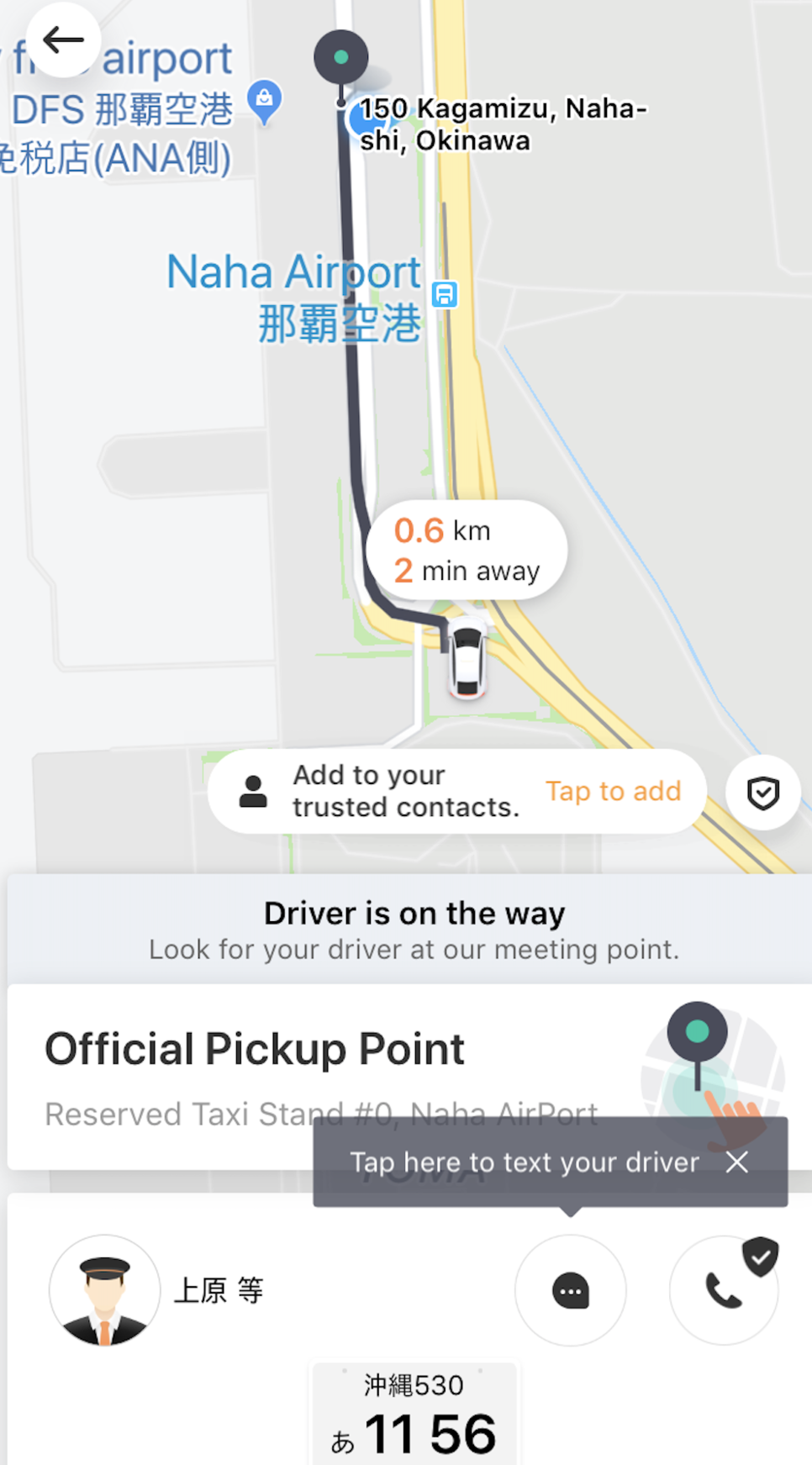 택시가 찾아지고 기사님의 성함과 택시 번호판이 나옵니다. 저는 우에하라상이고 1156번 택시가 오나 보네요.