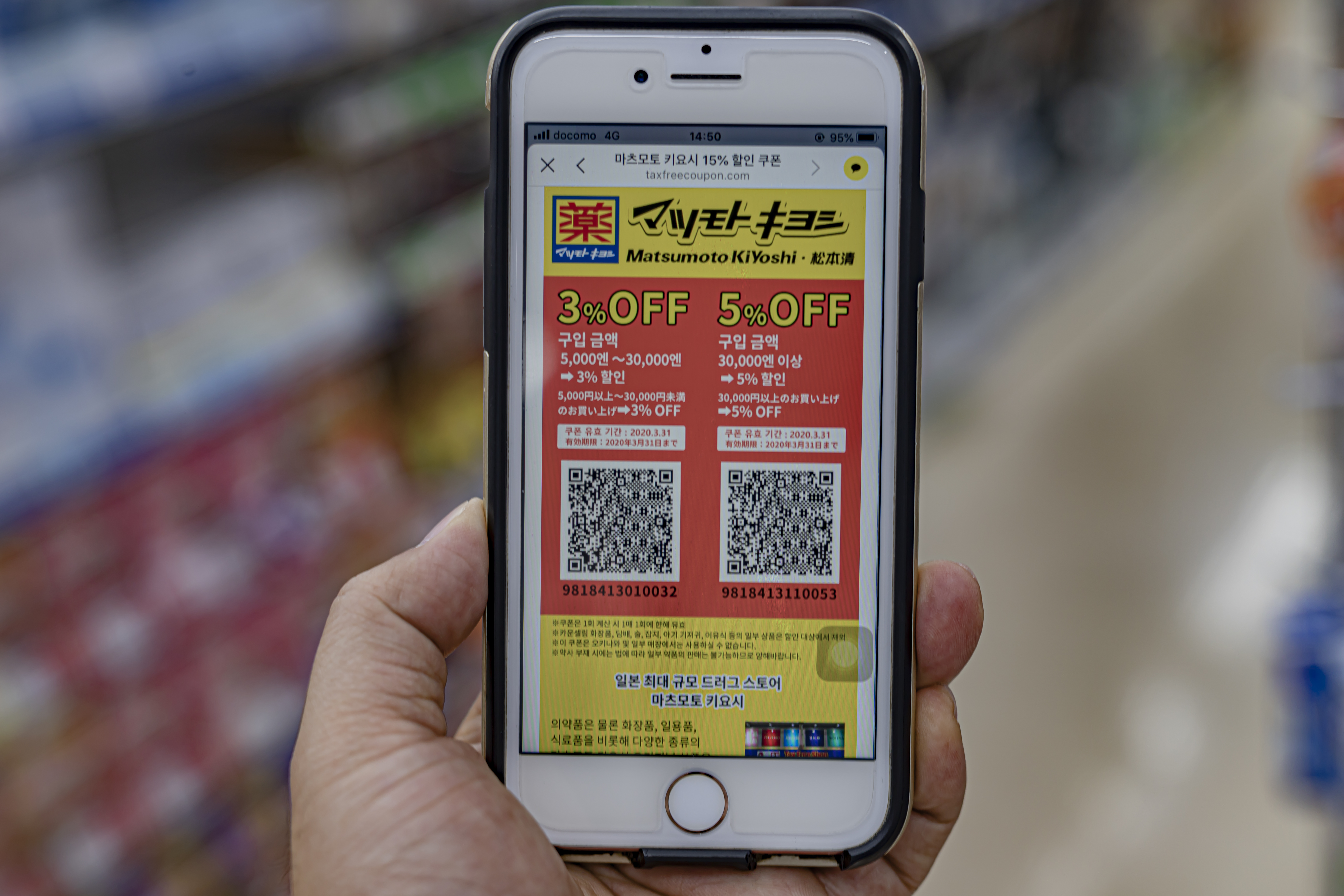 사용방법 위 할인쿠폰을 핸드폰에 다운로드 하세요. 마츠모토 키요시 점포에서 5000엔(세금 별도) 이상 구입후 쿠폰을 제시합니다. 할인혜택 5500엔~32999엔 : 면세 10% +3%할인 = 13% 할인 33000엔 이상 : 면세..