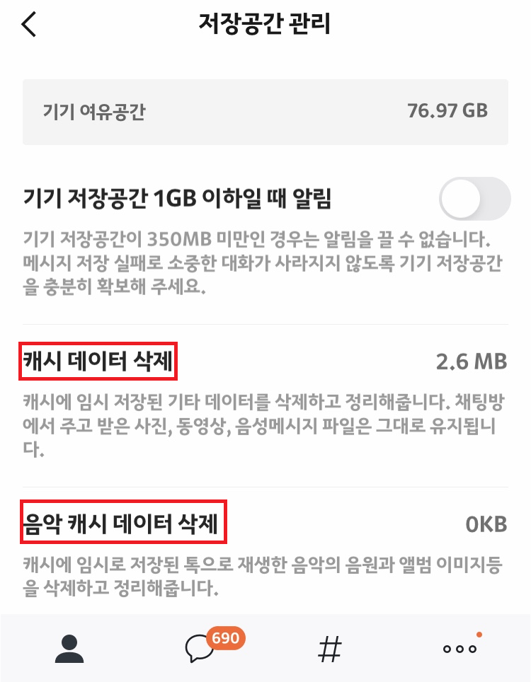 (카카오톡을 좀 더 가볍게 하시려면 음악 캐시 데이터도 삭제해 주시면 좋습니다)