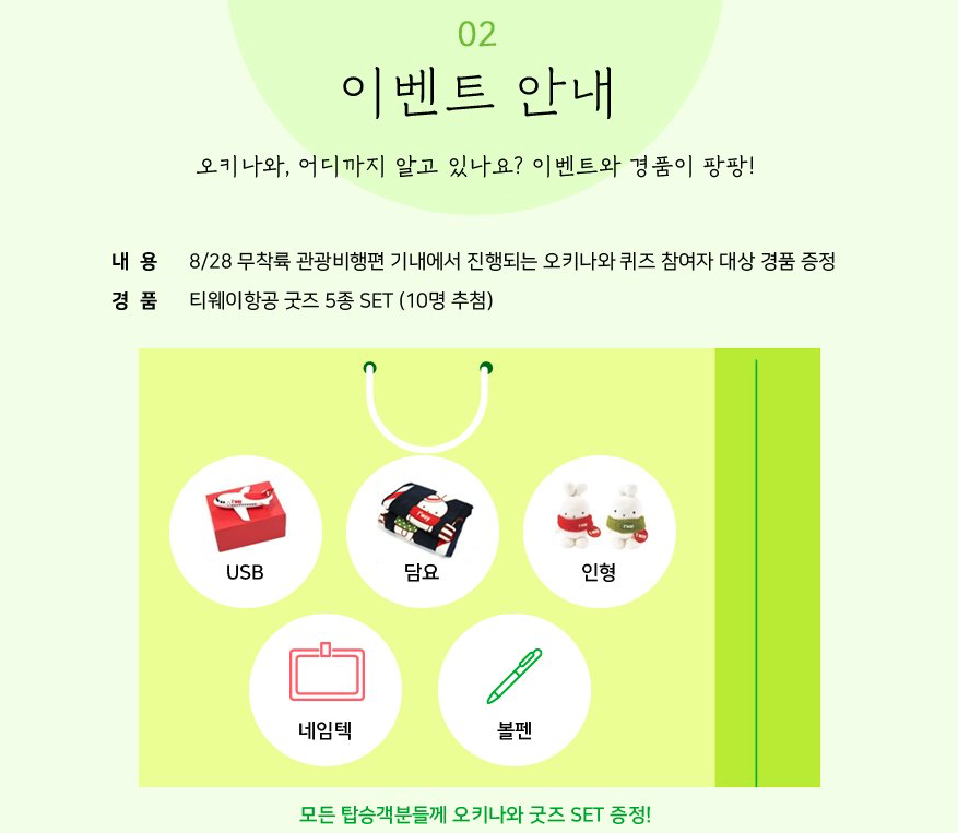 티웨이항공 관계자는 "오키나와 여행 테마라는 이색 항공편 탑승을 통해 미리 해외여행의 설렘을 느낄 수 있을 것”이라며 “기내 소독, 좌석 간 거리두기 등 철저한 방역지침을 지켜 안전한 비행을 제공할 것”이라고 합니다.