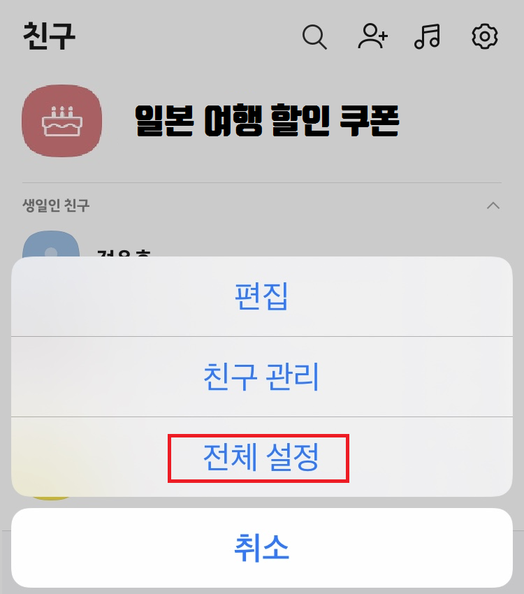 1. 카카오톡을 실행 시키고 오른쪽 위의 설정 버튼을 터치